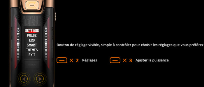 - 2 clics sur Fire : Accès aux paramètres (compteur de bouffées, LEDs ON/OFF, mode Smart)