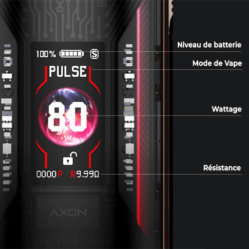 - Écran 0,96 pouces : Permet d'accéder à toutes les infos du pod (niveau de batterie, Wattage, compteur de puffs etc.)